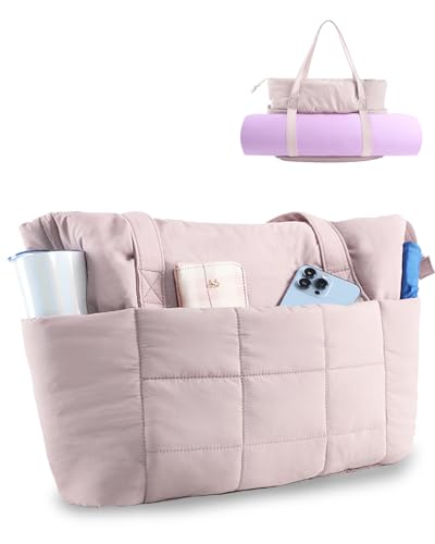 U+U Puffer Tote Bag for Women, Quilted Work Tote with 16" Laptop Sleeve, Luggage Sleeve & Yoga Mat Strap for Travel Gym School,Pink